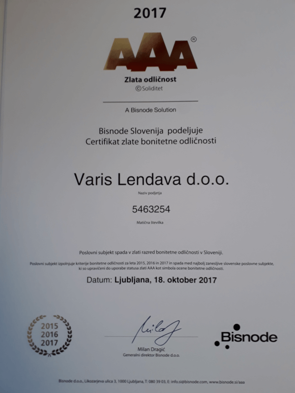 Varis Lendava je nosilec AAA – Zlate bonitete odličnosti. Podjetja, ki so nosilci zlate bonitete odličnosti predstavljajo najbolj zanesljiv, kredibilen in nizko tvegan poslovni subjekt za sodelovanje z vsemi poslovnimi partnerji: dobavitelji, kupci, zavarovalnicami, bankami in drugimi poslovnimi partnerji.